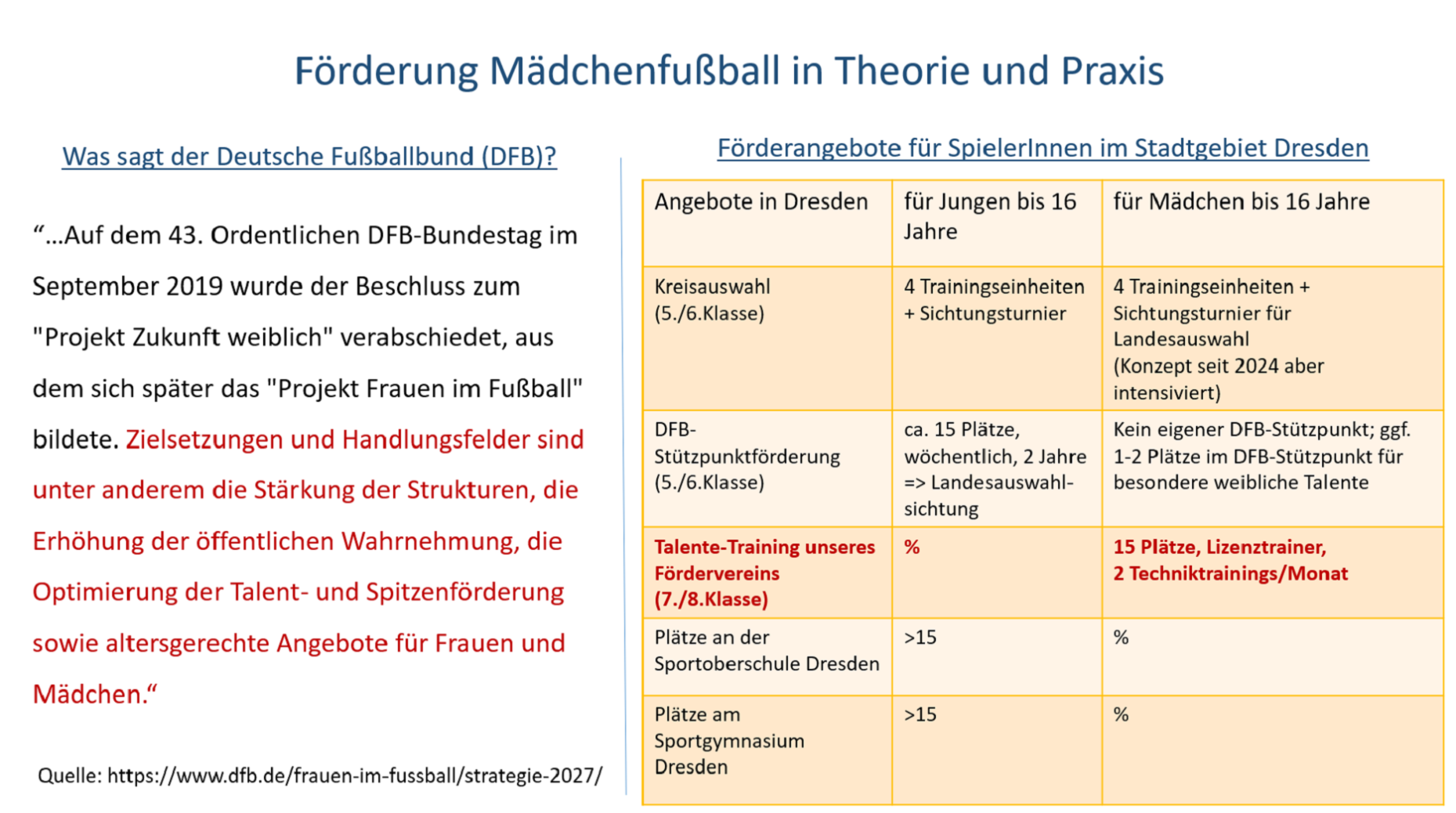Der Förderverein „Mädchenfußball in Dresden e.V.“ arbeitet ehrenamtlich und hat sich zum Ziel gesetzt, die Rahmenbedingungen für junge Fußballerinnen in Dresden zu verbessern, damit noch mehr Mädchen und junge Frauen eine Möglichkeit bekommen, ihr Talent in Fußballvereinen und Förderprogrammen weiterzuentwickeln.